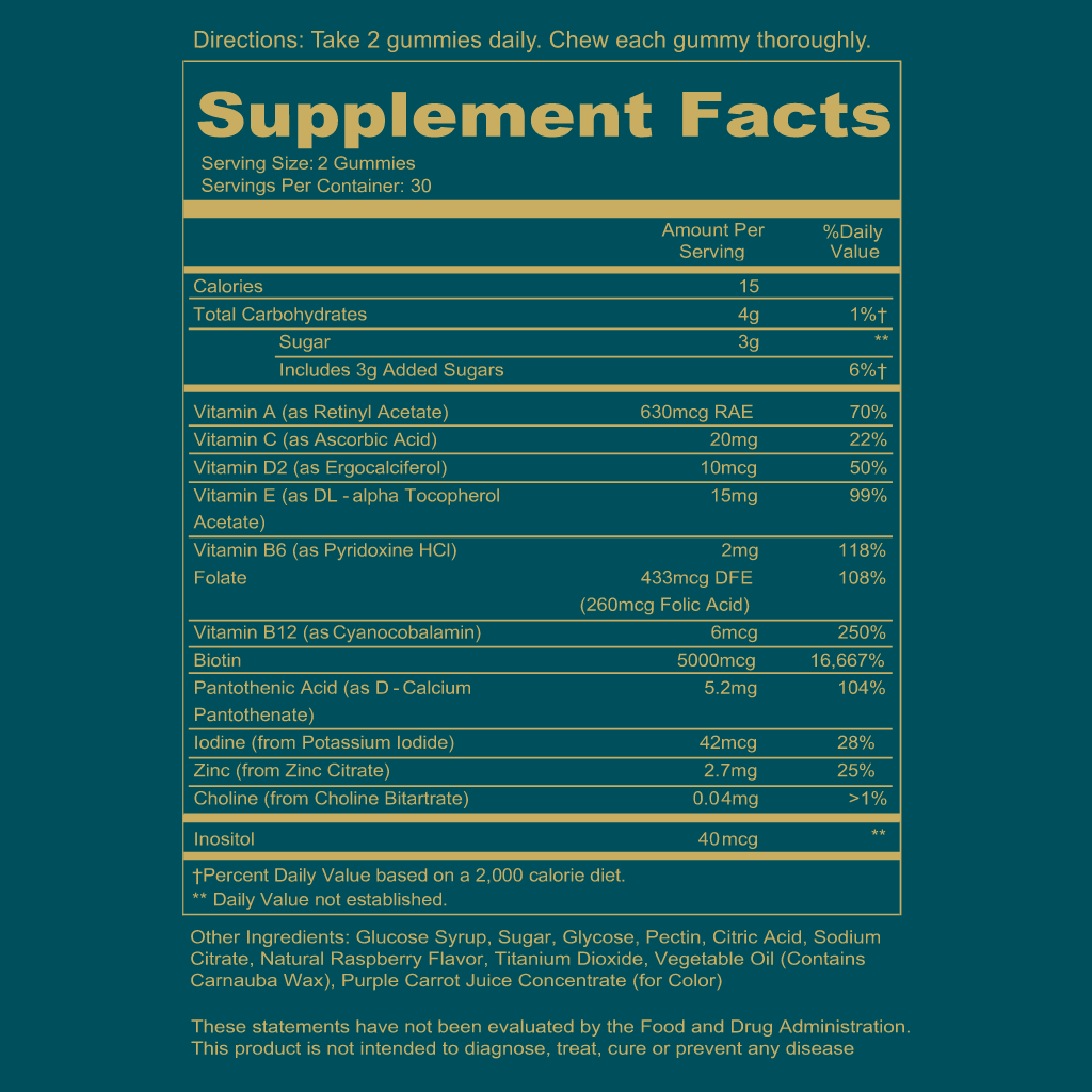 - Biotin and folic acid as well as vitamins B-5, 6, and 12 to help support your body’s production of keratin and collagen. Vitamins A, C, and E work to neutralize follicle-damaging free radicals while zinc helps to promote and maintain scalp health